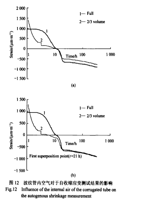 对比波纹管内空气对自收缩应变测试结果可见,在14d龄期时,含有空气的波纹管试件的自收缩较正常装满的波纹管试件的自收缩低。同样,这种差异也主要发生在测试初期。在终凝之后7h左右,2条曲线开始以完全相同的规律发展,由此可知,终凝7h以后的自收缩应变的测试结果与波纹管内部的空气无关。
